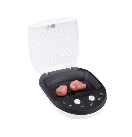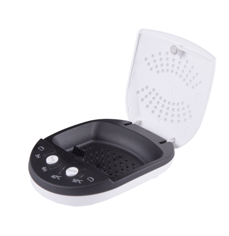 AID202型電子干燥器外殼表面設(shè)置兩處具有磁性的電池放置位,方便用戶干燥助聽(tīng)器時(shí)放置電池。